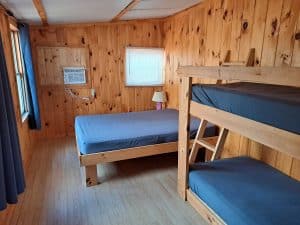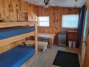 Welcome to Cabin 1. This one room cabin is located in the woods among our unserviced wilderness campsites and is a great choice for those guests looking for a camping experience without the tent. The interior of the cabin features a queen bed and a set of twin bunk beds and a dining area. There is no kitchen or bathroom or plumbing inside the cabin – a propane BBQ is provided for cooking outside and our main bathroom and shower house is located nearby. The cabin does have electricity and there is a small refrigerator provided.