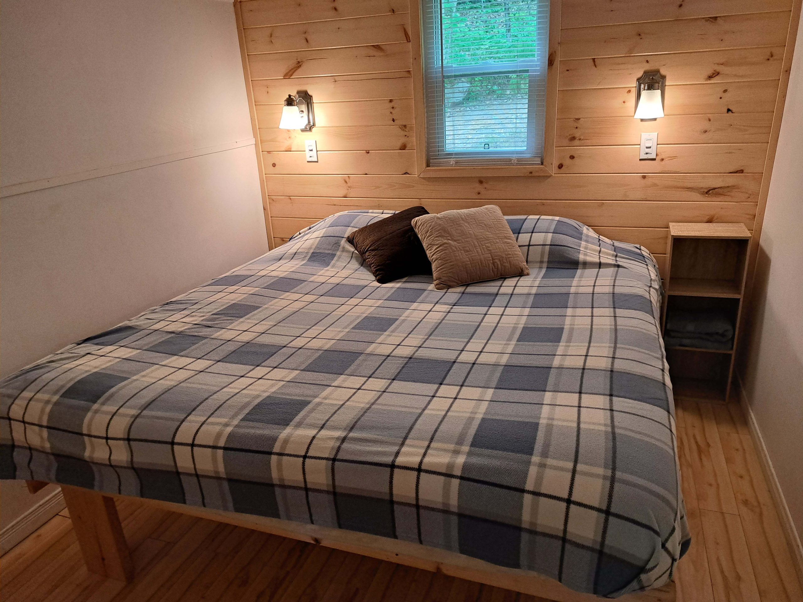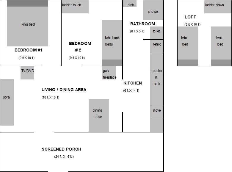 Welcome to Cottage 1. Enjoy your holiday in this cottage featuring a huge screened porch and a loft the kids will love. This cottage is a great choice for larger families – especially families with younger children. This cottage overlooks the front field and playground area – your children are always within sight. This is a full-service cottage with full kitchen, three-piece bathroom with shower, gas heater, and air conditioning. Sleeps six with one king bed, one set of twin bunks, and two twin beds in the loft.